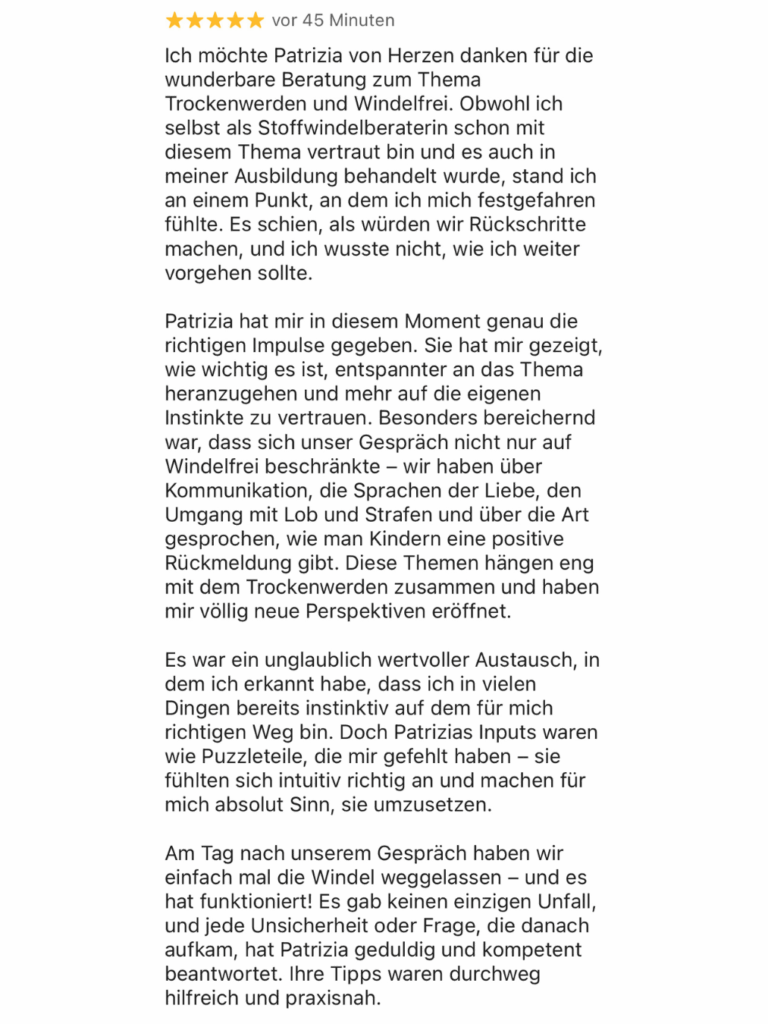 In einer 1:1 Beratung bekommst du genau das! Egal ob es um Stoffwindeln, Abhalten oder Herausforderungen und Fragen zum Trockenwerden geht – ich helfe dir gerne weiter!