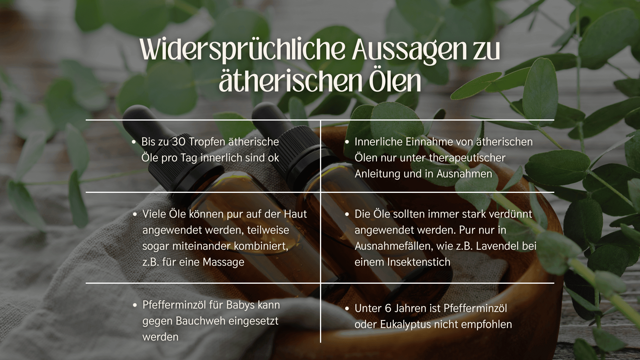 Die Meinungen zur Anwendung von ätherischen Ölen gehen stark auseinander. Da ich selbst (noch) keine Aromatherapeutin bin, kann ich dir hier auch nur die Infos geben, die ich selbst recherchiert habe. Da ich Dinge gerne hinterfrage, ist das vielleicht ein Vorteil für dich 😉