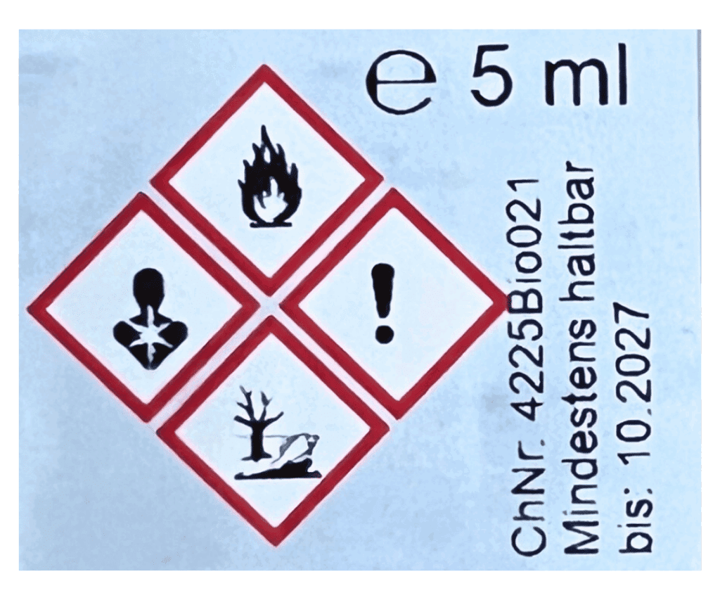 Noch ein paar Infos zur Verordnung: Wenn das ätherische Öl den Verwendungszweck „Kosmetikum“ oder „Lebensmittel“ hat, brauchen die Gefahrenpiktogramme nicht angegeben sein. Sobald das Öl für mehrere Zwecke eingesetzt werden kann, muss es wieder angegeben sein.