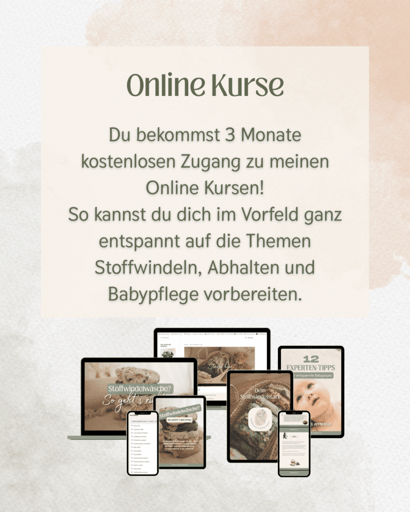 Zuerst bekommst du Zugang zum Kursbereich „Miet- und Testpaket“. In diesem findest du einige informative Videos, in denen du erfährst, mit welchen Windeln du am besten startest, wie du sie richtig befüllst und anlegst und wie die Windeln gelagert und gewaschen werden müssen. Außerdem zeige ich dir hilfreiche Falttechniken für die Neugeborenenzeit.